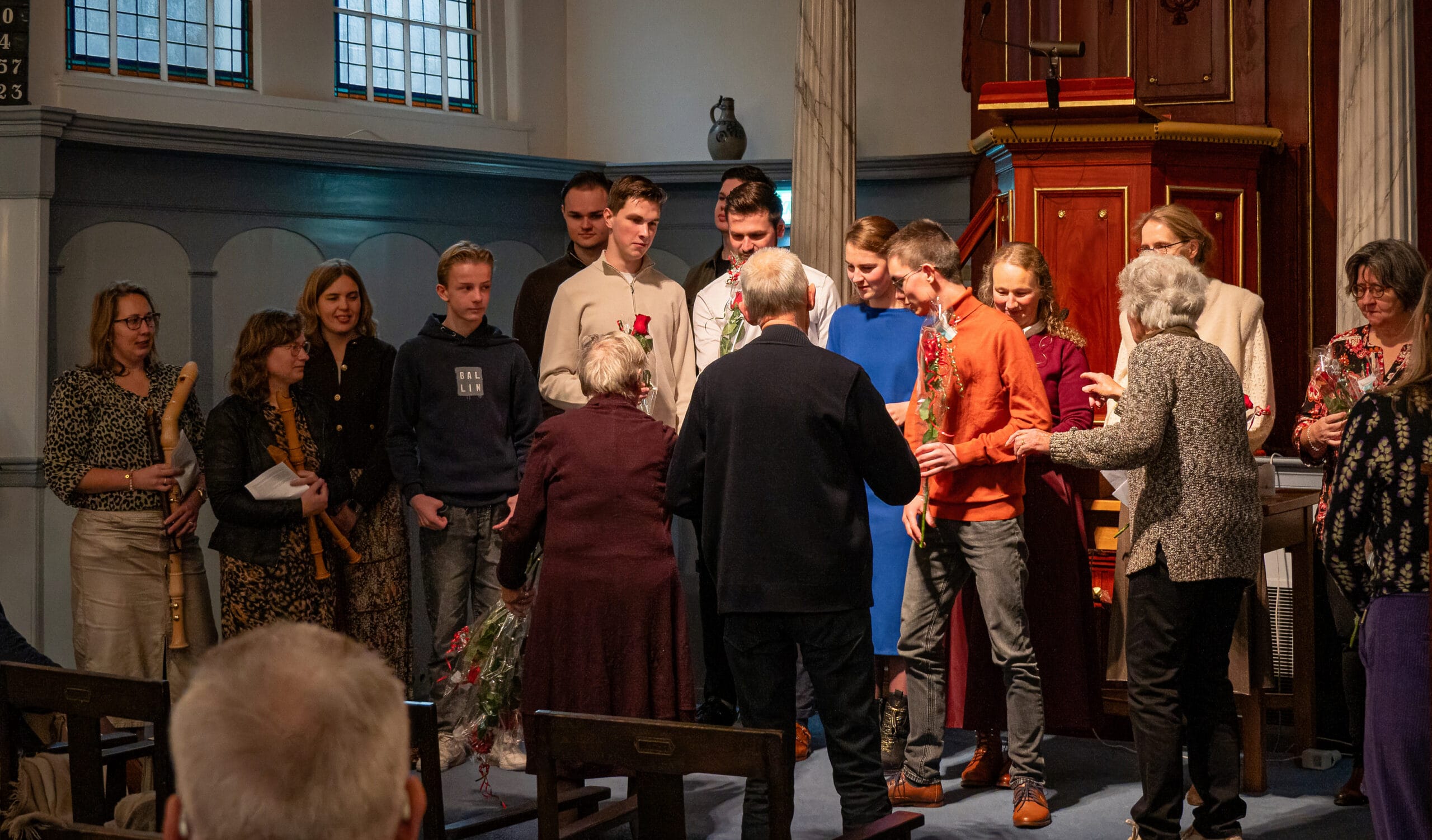Voor een mooie afwisseling zorgden twee pianoleerlingen met een vierhandige uitvoering van het bekende Sheep may safely graze, oftewel Schafe können sicher weiden, eveneens van Bach. Voor alle twintig medewerkenden was er na afloop een dankbaar applaus en een mooie roos.