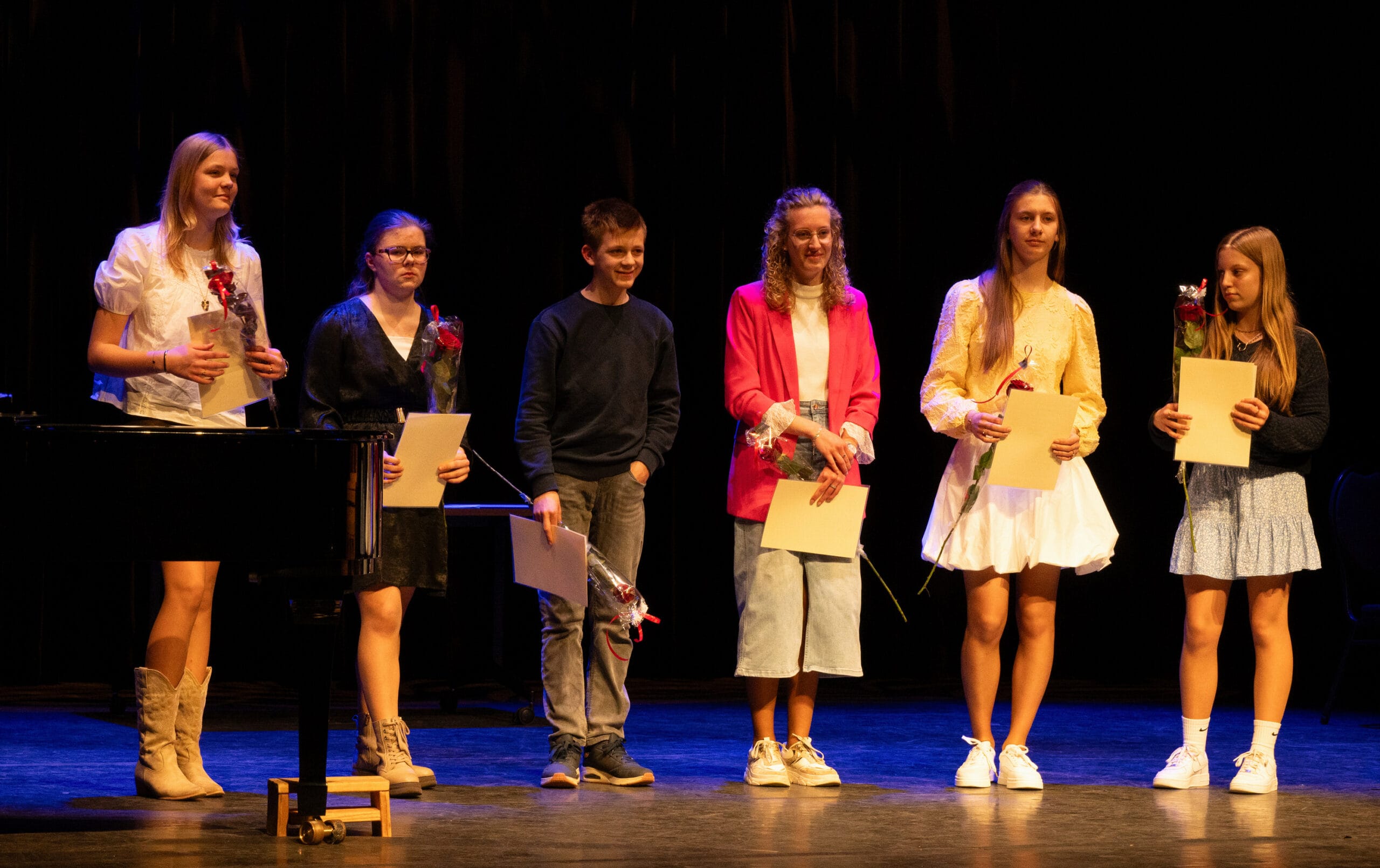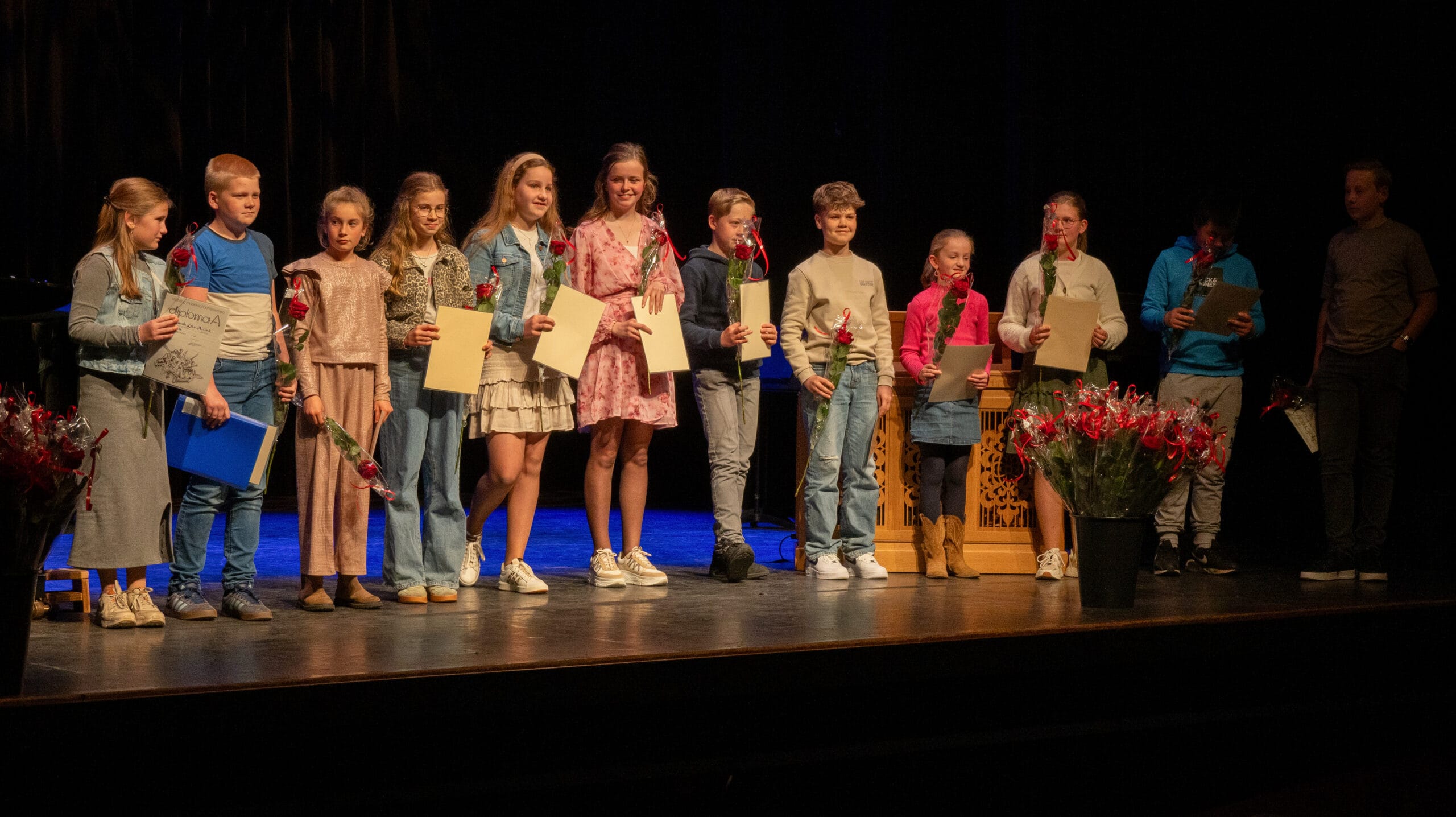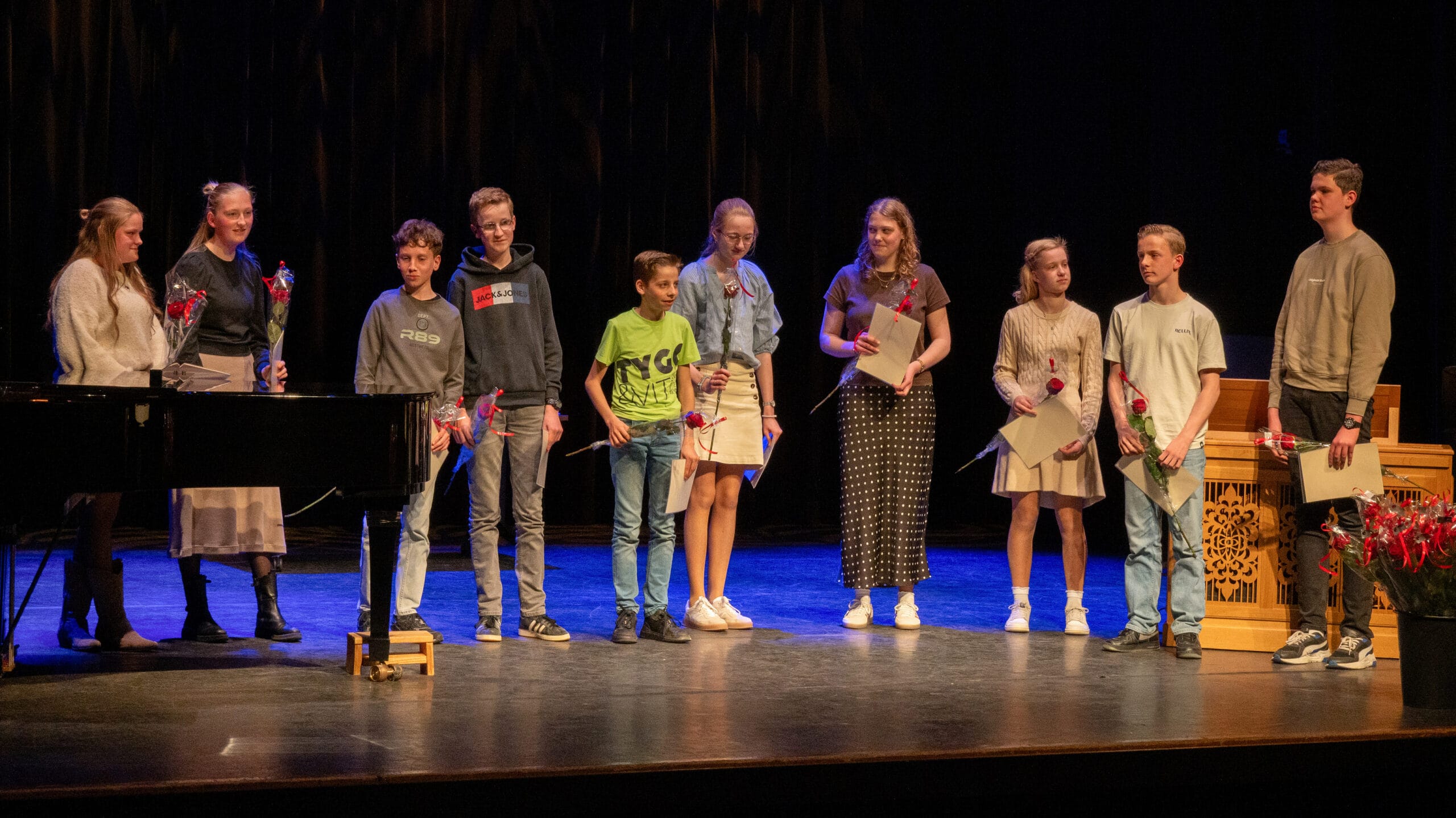 De grote zaal van het Parkgebouw was bijna tot de nok toe gevuld met publiek voor het Laureatenconcert van de Rijssense Muziekschool. Liefst 106 leerlingen deden in de laatste week van maart examen op hun instrument en kregen tijdens het Laureatenconcert hun diploma of getuigschrift uitgereikt. Natuurlijk klonk er ook muziek: tijdens de examens hadden de commissieleden aangetekend welke muziekstukken in aanmerking kwamen om bij de uitreiking van de diploma’s nogmaals te klinken. Dat leverde een aantrekkelijk en gevarieerd programma op, en er werd op hoog niveau gemusiceerd! Het ging van Vivaldi naar Bach, van The Snowman naar Skyfall. Verschillende leerlingen speelden helemaal uit het hoofd, en ook waren enkele eigen composities te horen. Vanzelfsprekend kregen de drie leerlingen die cum laude geslaagd waren de gelegenheid om iets uit hun examenprogramma nogmaals te presenteren. Voor de geslaagden was er niet alleen een diploma, maar ook een mooie roos! Op onze Facebookpagina vindt u nog méér foto’s.